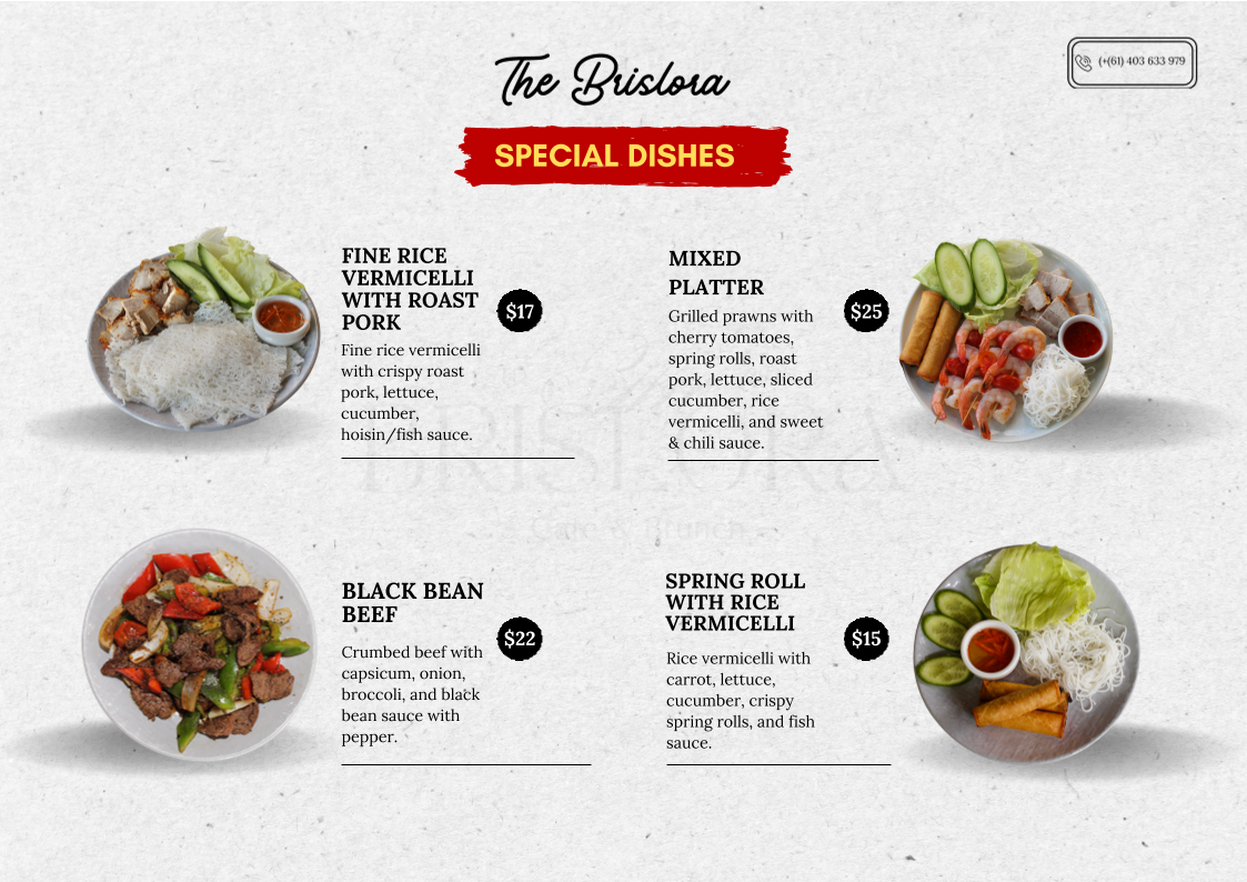 Vietnamese Dishes: These menu items offer traditional Vietnamese flavors featuring ingredients like rice vermicelli, prawns, roast pork, fresh vegetables, and various dipping sauces. Choices include rice paper rolls, spring rolls, and mixed platters that combine different elements.