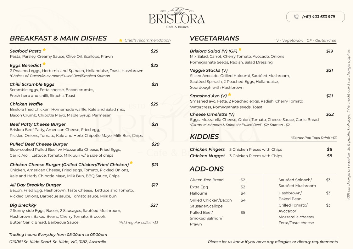 Vegetarian Options: This section includes a variety of salads and plated dishes featuring fresh vegetables, poached eggs, and gourmet touches such as haloumi cheese, sautéed mushrooms, and hollandaise sauce. Notable items include the Brislora Salad Mix, Veggie Stacks, and the Smashed Avo with feta and pomegranate seeds.