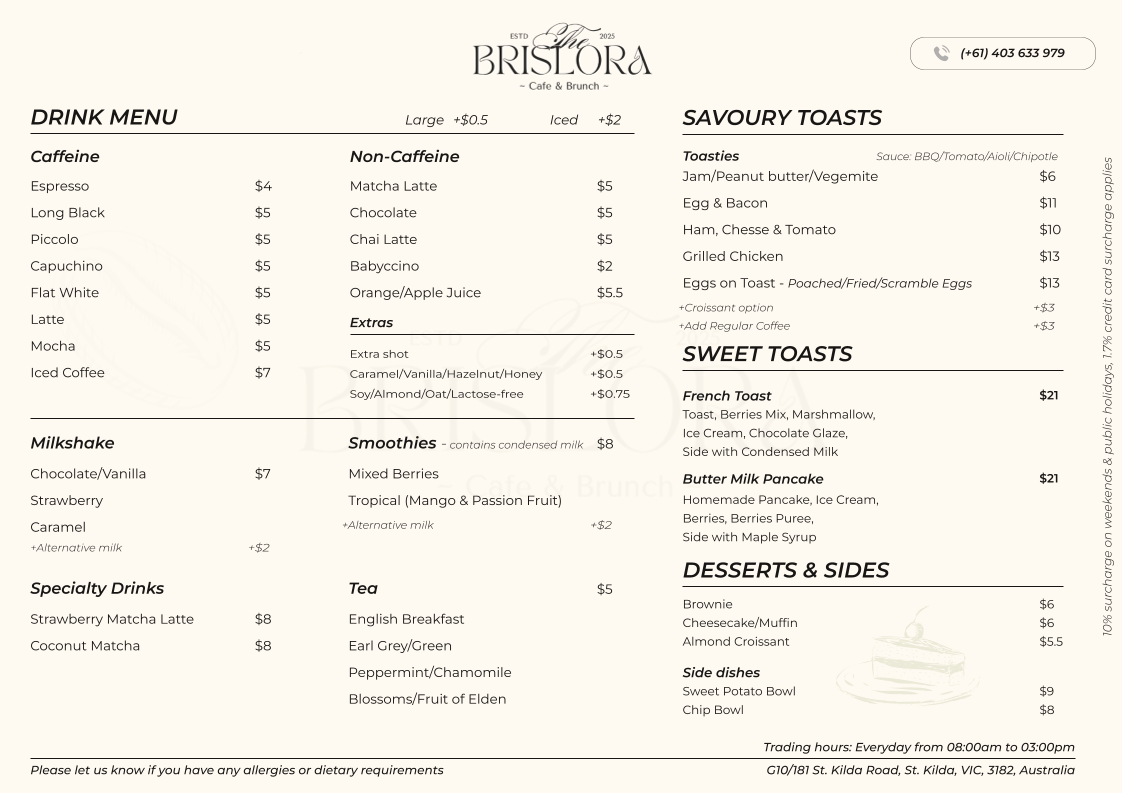 The menu at The Brislora is thoughtfully organized to cater to a range of dining preferences, featuring options suitable for breakfast, brunch, and light meals throughout the day. The offerings include vegetarian dishes, Vietnamese specialties, and a selection of meals designed for younger guests.